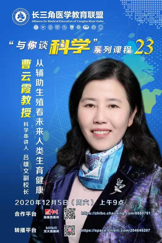 12月5日起,由长三角医学教育联盟发起的“与你谈科学”系列课程启动第八季。该系列课程邀请了长三角医学教育联盟十所高校的卓越医学基础科学家、知名学者和临床研究者组成“科学家梦之队”授课。系列课程第23课(第八季第一讲)由我校校长曹云霞教授讲授《从辅助生殖看未来人类生育健康》。12月5日(周六)上午9点,准时开讲。